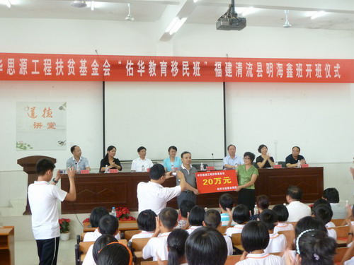 儀式上,王鳳玲、陳敏杰分別代表佑華公益基金和福建明海鑫企業(yè)股份有限公司,向清流縣“思源佑華教育移民班福建清流縣明海鑫班”各捐贈(zèng)20萬(wàn)元和10萬(wàn)元,用于該班50名學(xué)生三年的生活補(bǔ)助,每人每年2000元。縣教育局局長(zhǎng)江長(zhǎng)文分別向“中華思源扶貧基金會(huì)佑華公益基金”和“福建明海鑫股份有限公司”贈(zèng)送銅牌,承辦學(xué)校城關(guān)中學(xué)介紹了“思源佑華教育移民班”的建班情況,并表示一定要履職盡責(zé),把“思源佑華教育移民班”辦成出成績(jī)、出人才的勵(lì)志班、成功班、示范班。教師、學(xué)生、家長(zhǎng)代表也先后做了表態(tài)發(fā)言,表示一定不辜負(fù)民建各級(jí)領(lǐng)導(dǎo)和各界愛(ài)心人士的期望,認(rèn)真學(xué)習(xí)、努力工作,奉獻(xiàn)社會(huì)、報(bào)效祖國(guó)。